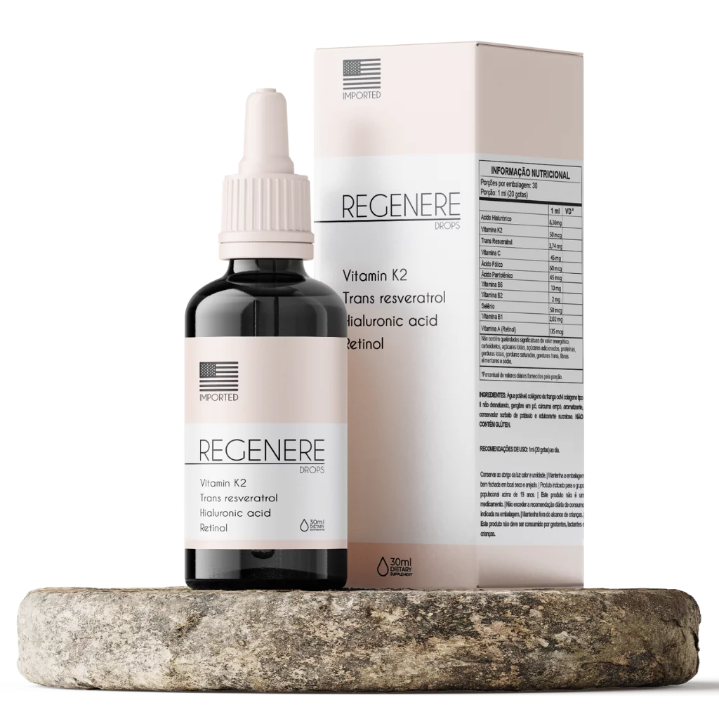 Graças a Vitamina K2 combinada ao Ácido Hialurônico que traz moléculas de água para células da derme, REGENERE age como preenchedor e suaviza rejuvenesce todo seu organismo.